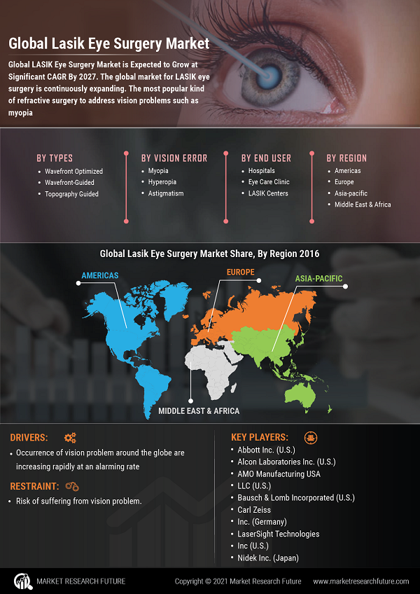 Nidek, Inc., AMO Manufacturing USA LLC, Abbott Inc., Carl Zeiss, Inc., Alcon Laboratories, Inc., Lasersight Technologies. Inc. and Bausch & Lomb Surgical, Inc. are some of the leaders driving the Global LASIK Eye Surgery Market. Profiling those in its analysis MRFR finds out their strategies placing them at the forefront of completion.